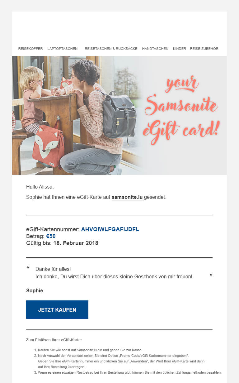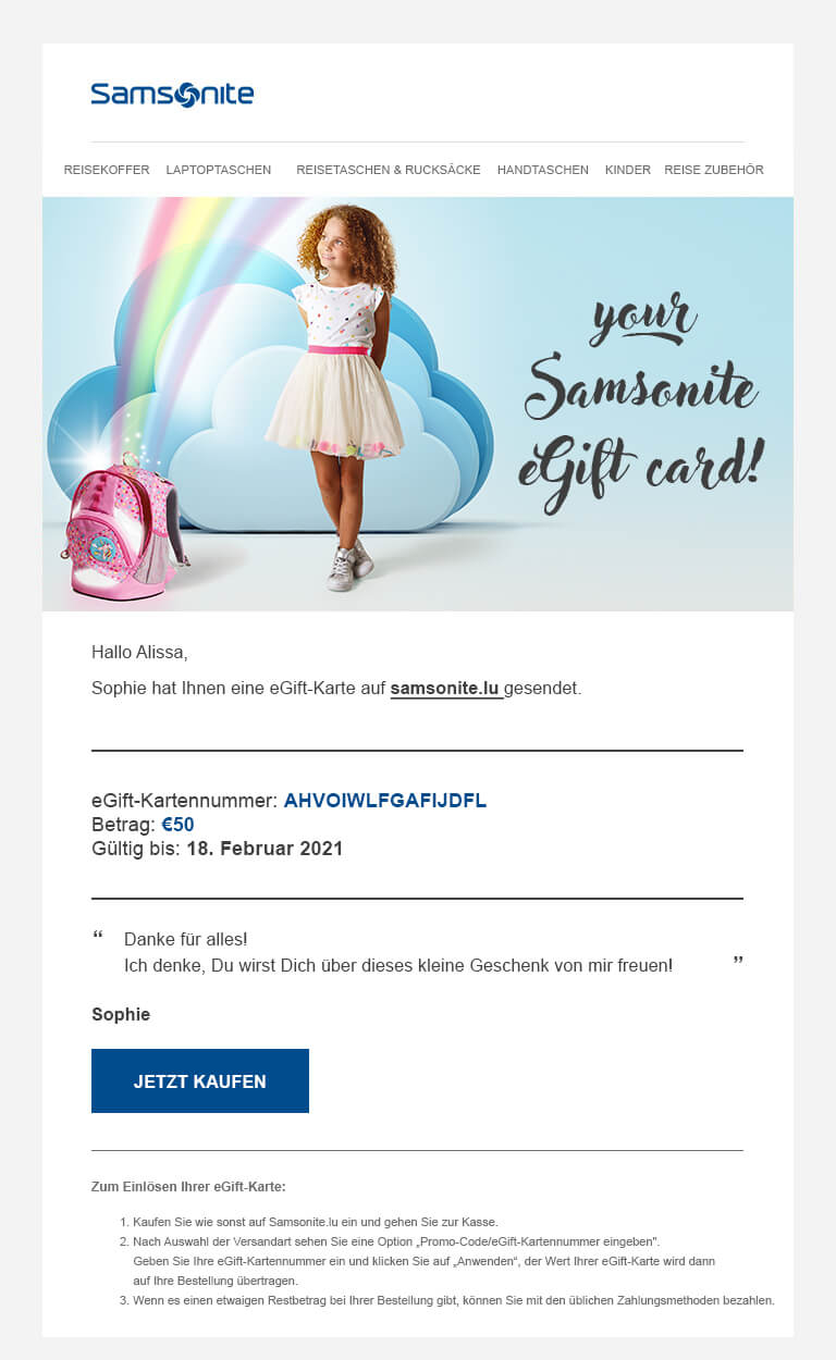 - Wenn Sie weitere Informationen über die eGift-Karte wünschen, können Sie eine E-Mail an customer.care@samsonite.com.